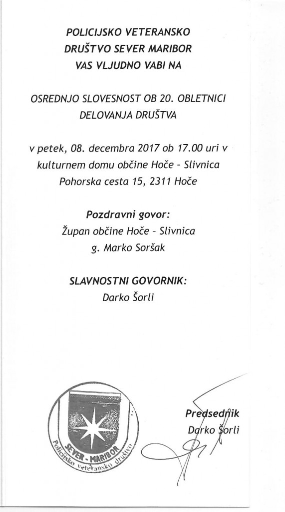 Osrednja slovesnost ob 20. obletnici društva, bo 8.12.2017 ob 17.00 uri v kulturnem domu občine Hoče - Slivnica, Pohorska cesta 15, Hoče.